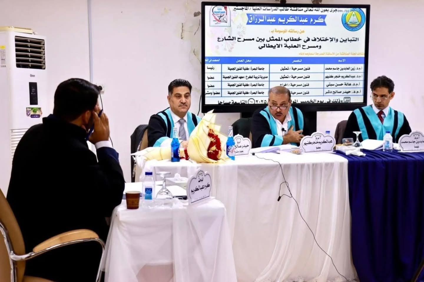 وعلى هامش الزيارة ، حضر الدكتور ياسر البراك مناقشة رسالة ماجستير تناولت تجربته المسرحية ، للطالب كرم عبد الكريم عبد الرزاق مشيداً بالجهود البحثية المبذولة في هذا المجال ، فضلاً عن تكريمه لمسؤول شعبة شؤون الطلبة في كلية الفنون جامعة البصرة لما قدمه من مساعدة و تعاون مع كليتنا في اجراءات قبول الطلبة .