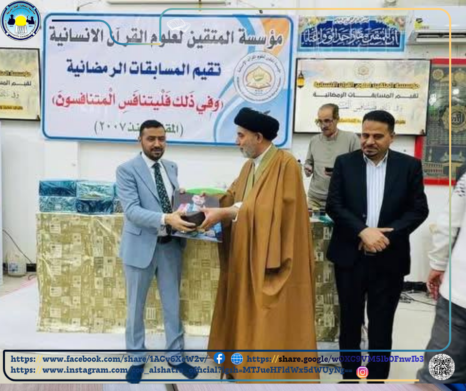 في إطار رسالتها السامية الرامية إلى الاحتفاء بالطاقات التربوية والعلمية المتميزة في قضاء الشطرة، كرّمت مؤسسة المتقين الأستاذ الدكتور صفاء حسين علي عميد كلية التربية تقديرًا لعطائه الأكاديمي الزاخر ، وجهوده العلمية الرصينة ، وإسهاماته البارزة في خدمة المسيرة التعليمية، وبمناسبة ترقيته إلى مرتبة الأستاذية ، التي تُعدّ أسمى المراتب العلمية وأرفعها شأنًا.