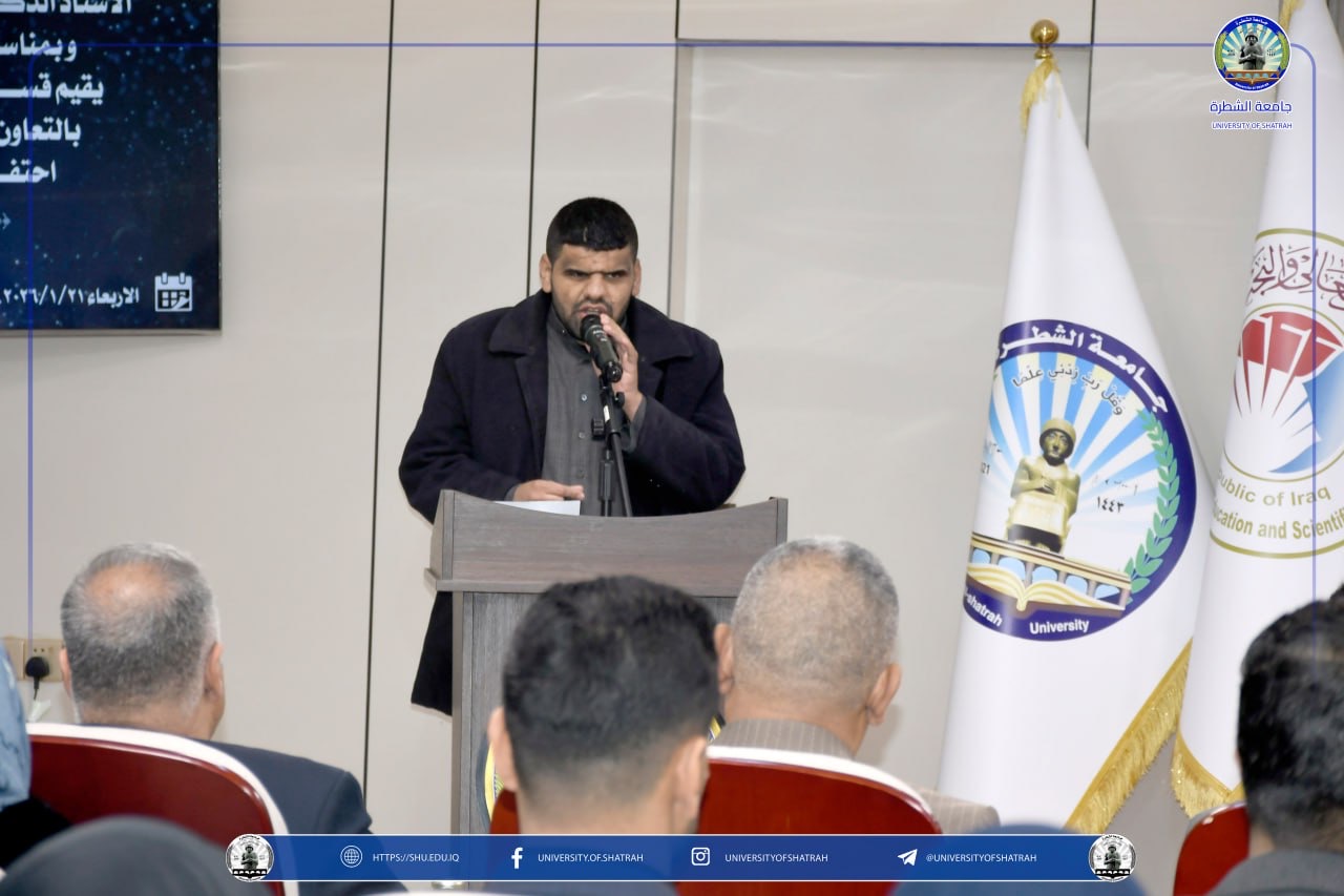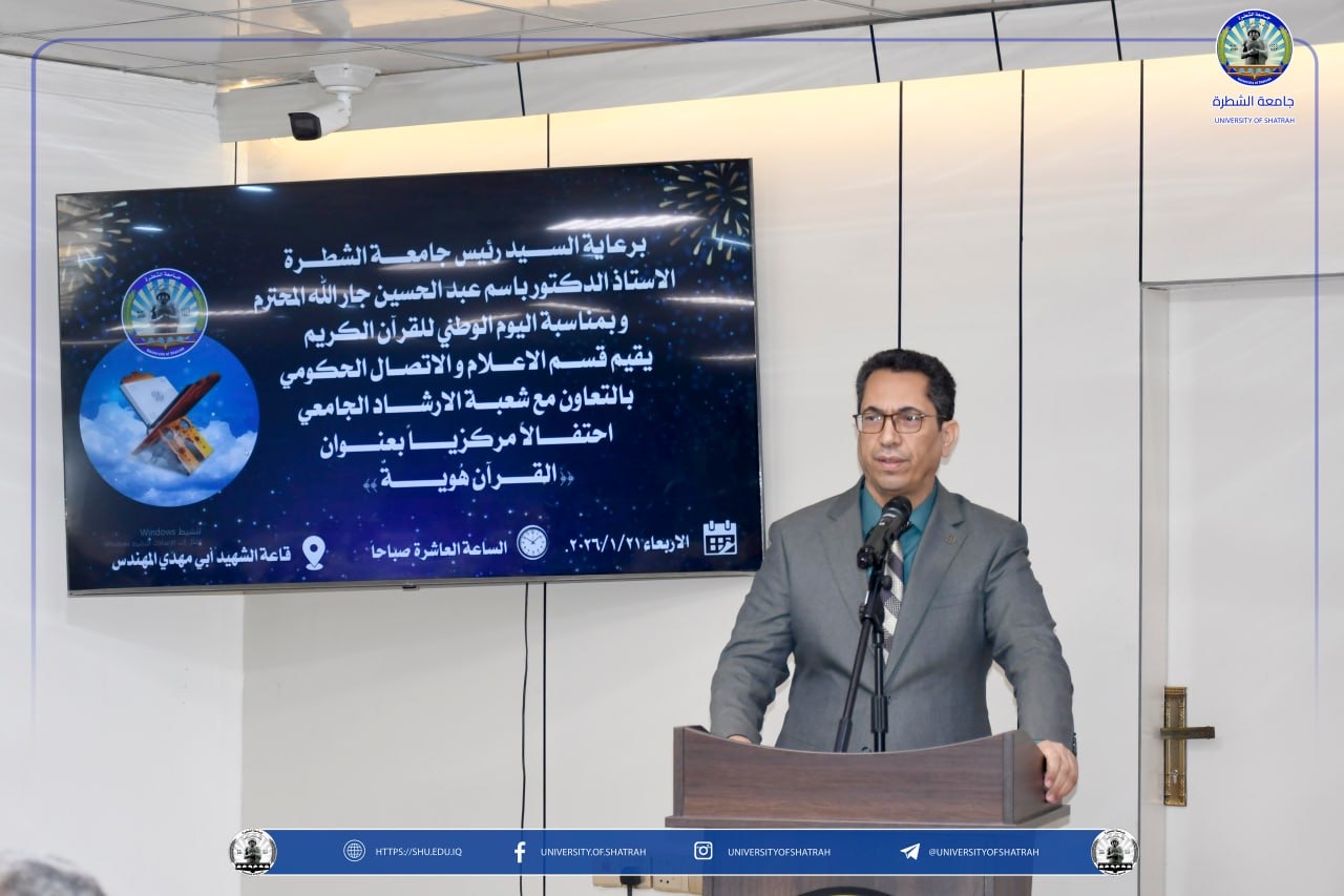 برعاية السيد رئيس جامعة الشطرة الأستاذ الدكتور باسم عبد الحسين جار الله المحترم، وبمناسبة اليوم الوطني للقرآن الكريم، أقام قسم الإعلام والاتصال الحكومي بالتعاون مع شعبة الإرشاد الجامعي، احتفالًا مركزيًا بعنوان (القرآن هويّة)، يوم الأربعاء ٢١ كانون الثاني ٢٠٢٦، على قاعة الشهيد أبي مهدي المهندس، بحضور الملاكات التدريسية والوظيفية وجمعٌ من الطلبة.