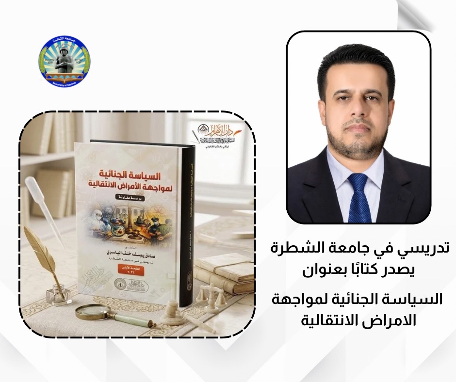 في إنجاز علمي مميز يُضاف إلى سجل الإصدارات الأكاديمية في جامعة الشطرة، أصدر المدرس الدكتور صادق يوسف خلف من قسم الشؤون القانونية - رئاسة الجامعة ، كتاباً علمياً جديداً بعنوان: “السياسة الجنائية لمواجهة الامراض الانتقالية”، الذي يقع في 602 صفحة من القطع المتوسط، ويُعد من الإصدارات الرائدة في السياسة الجنائية .